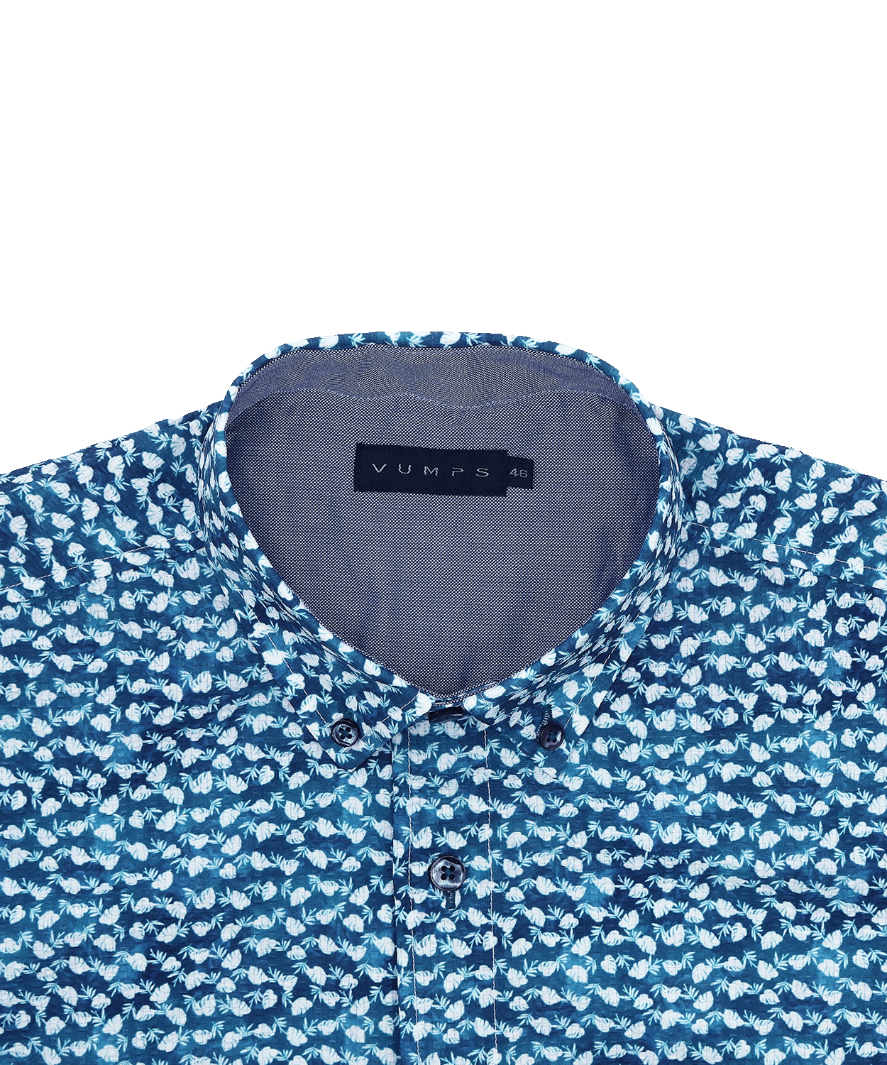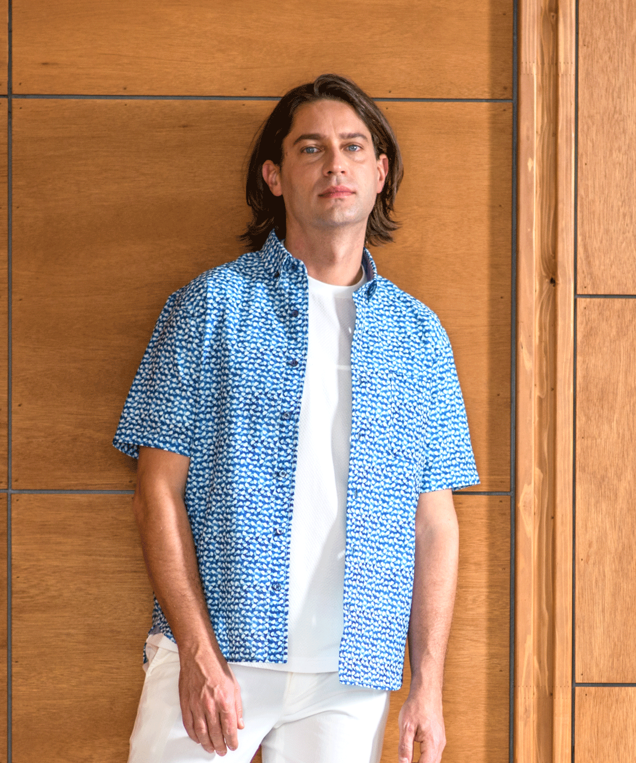 リーフ柄のプリントと夏らしいきれいな色目の半袖カジュアルシャツは、ジャケットなどのインナーに合わせても良し、半袖Tシャツなどの上に軽く羽織るも良し、前ボタンを留めてスタンダードな着用も良し。