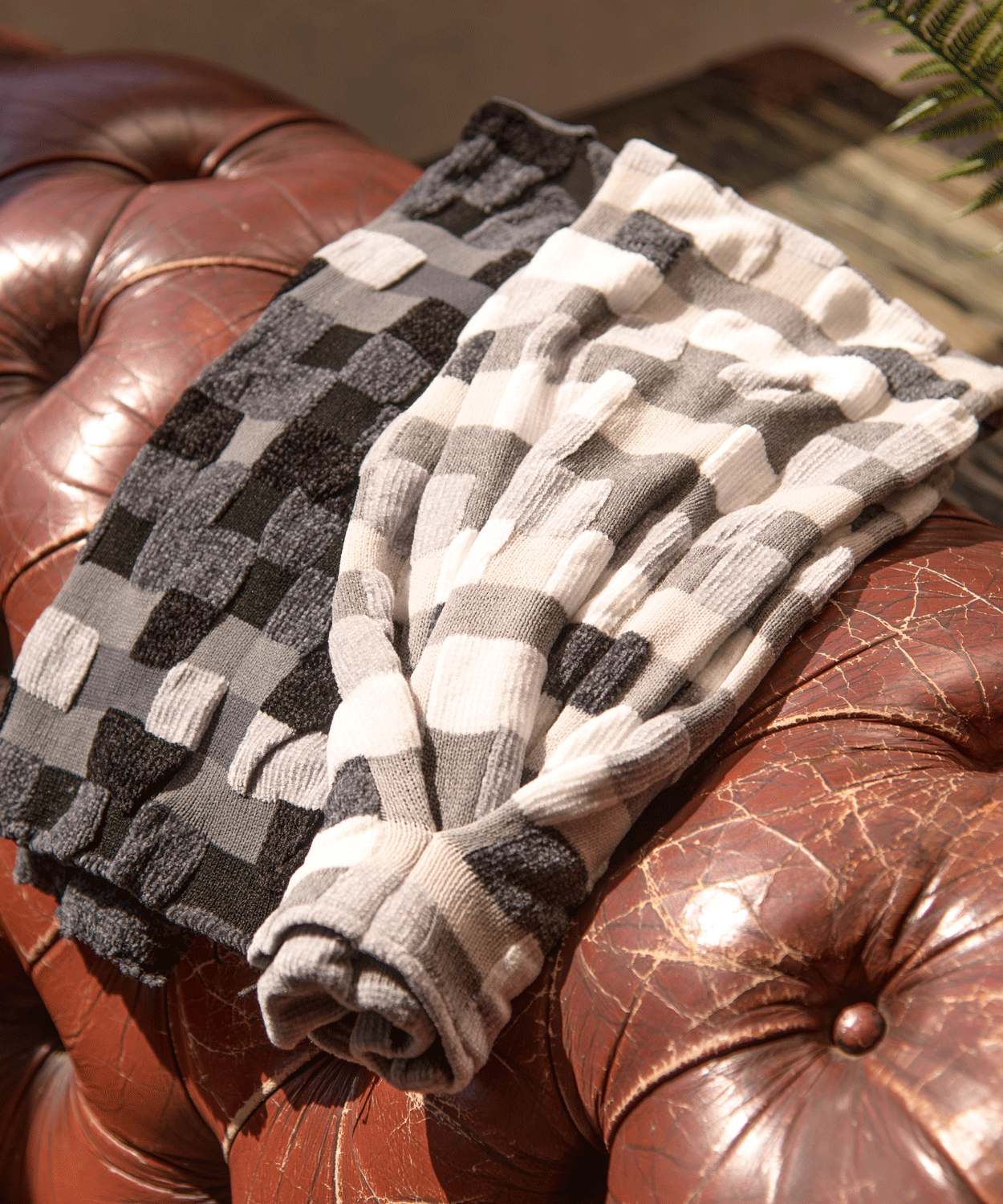 端のスリットにもう一方を通すだけで簡単に着脱できる、スリットインタイプのマフラーです。