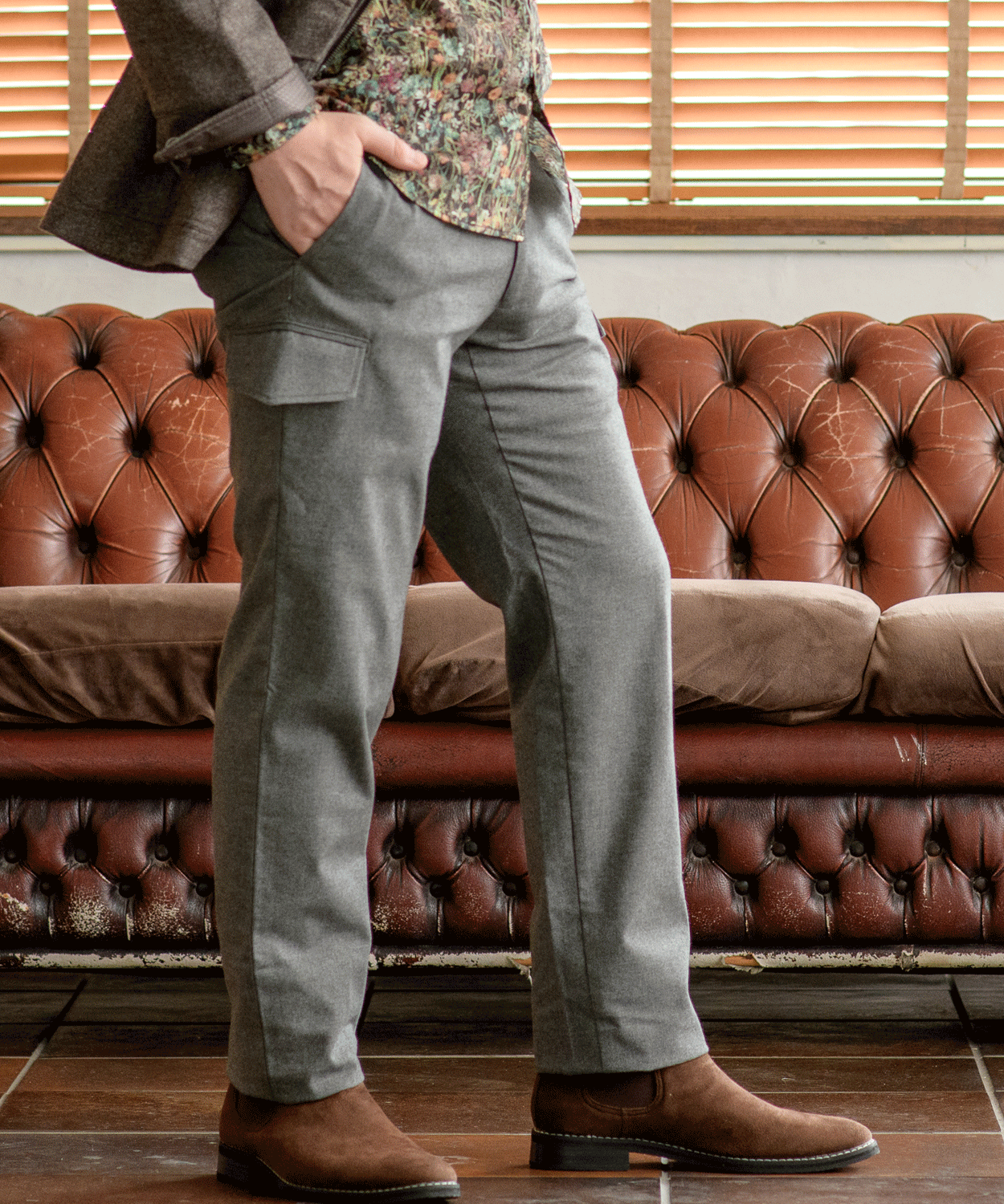 合成繊維でありながら、まるでウールフランネルのような暖かみと柔らかさを持ち、秋冬シーズンにぴったりのボトムスです。