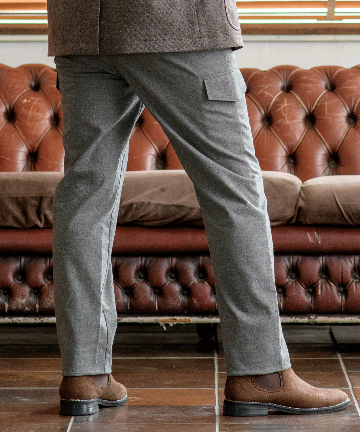 綿とアクリルレーヨンをブレンドした混紡糸を使用した〈ソフトサーモ〉素材のメンズカーゴパンツです。
