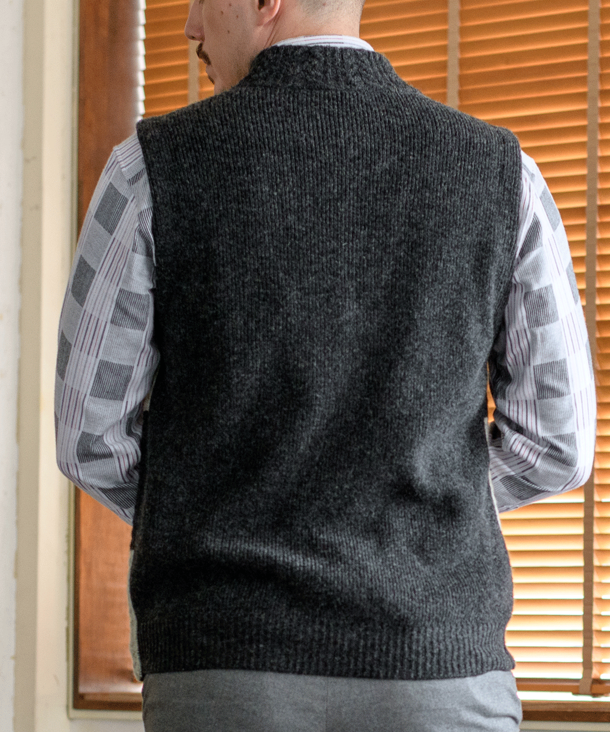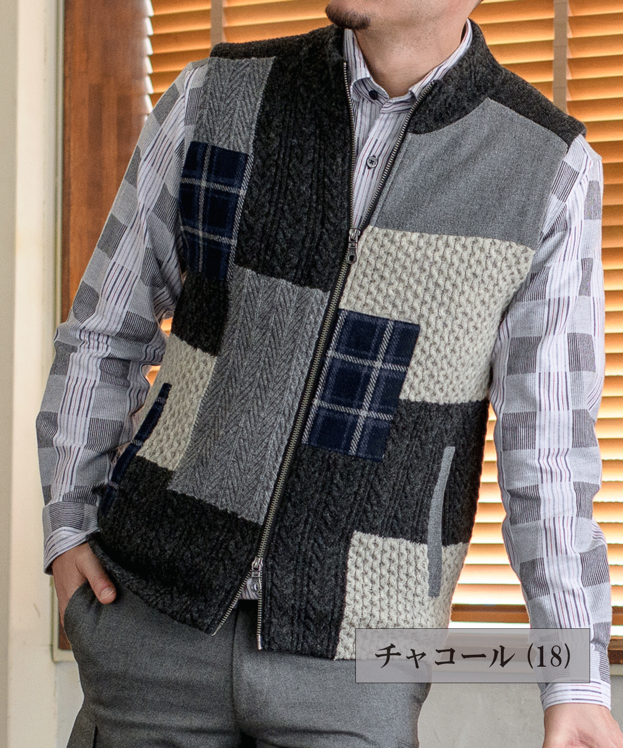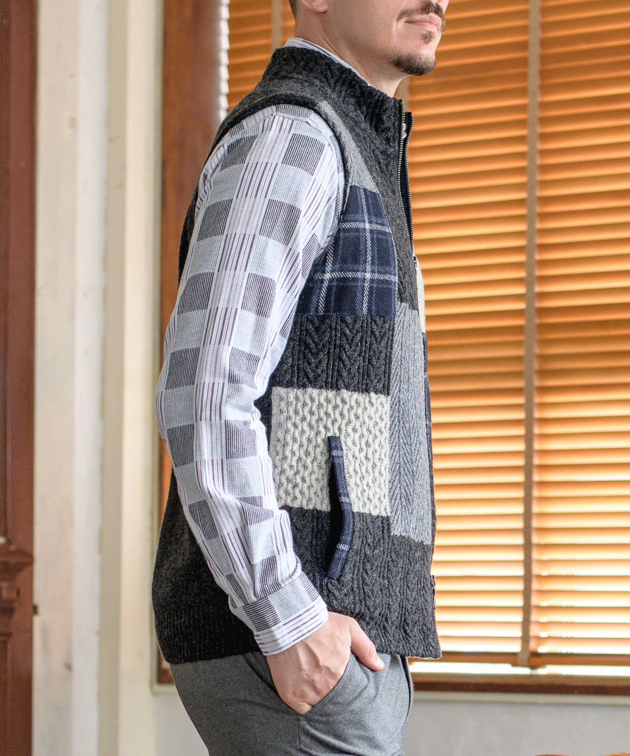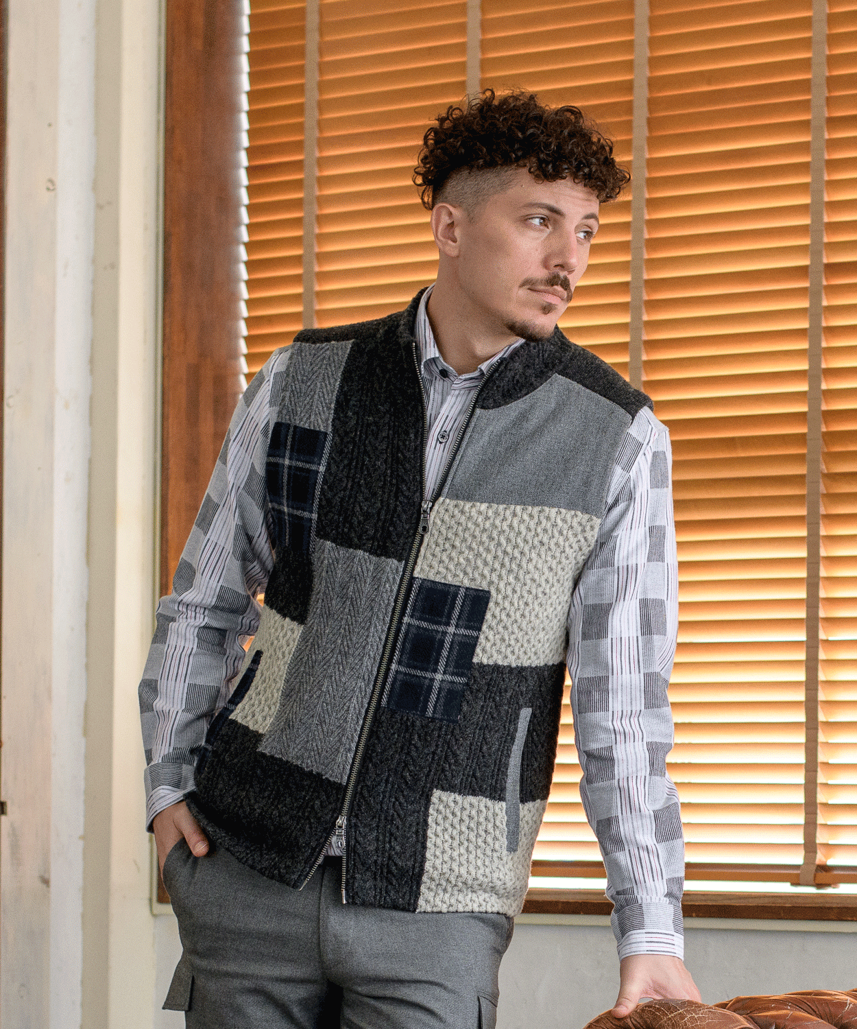 異なる編地のニットにチェック柄の布帛素材を巧みに組み合わせた、ジップアップ仕様のベスト。