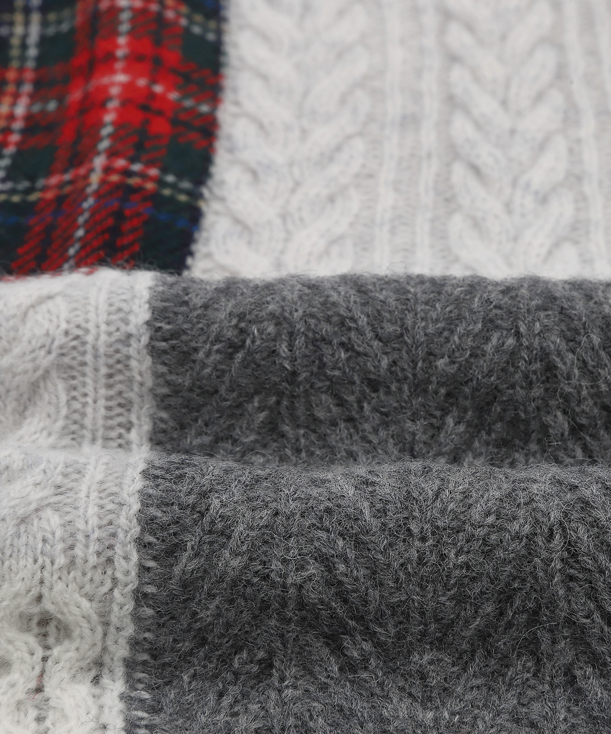 表情豊かなニットにパッチワークで加えられたチェック生地が絶妙なアクセントとなり、ベーシックなアイテムでありながらも、どこか遊び心を感じさせる一着に仕上がっています。