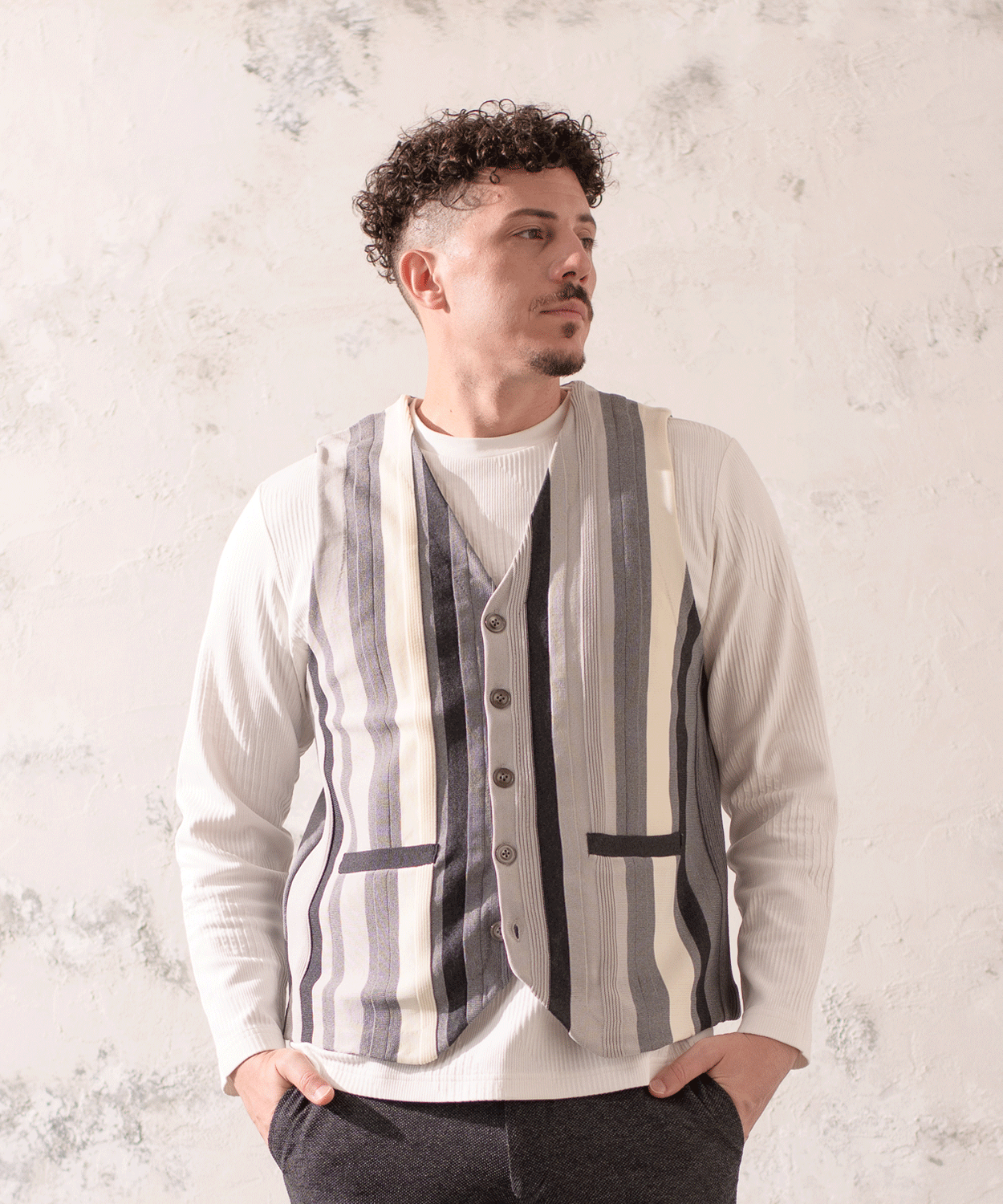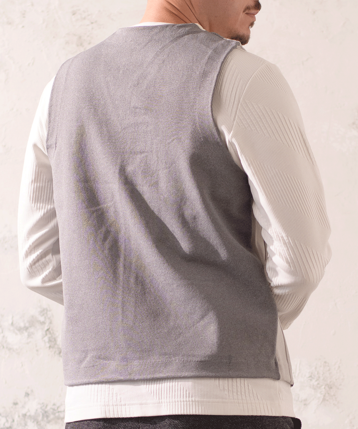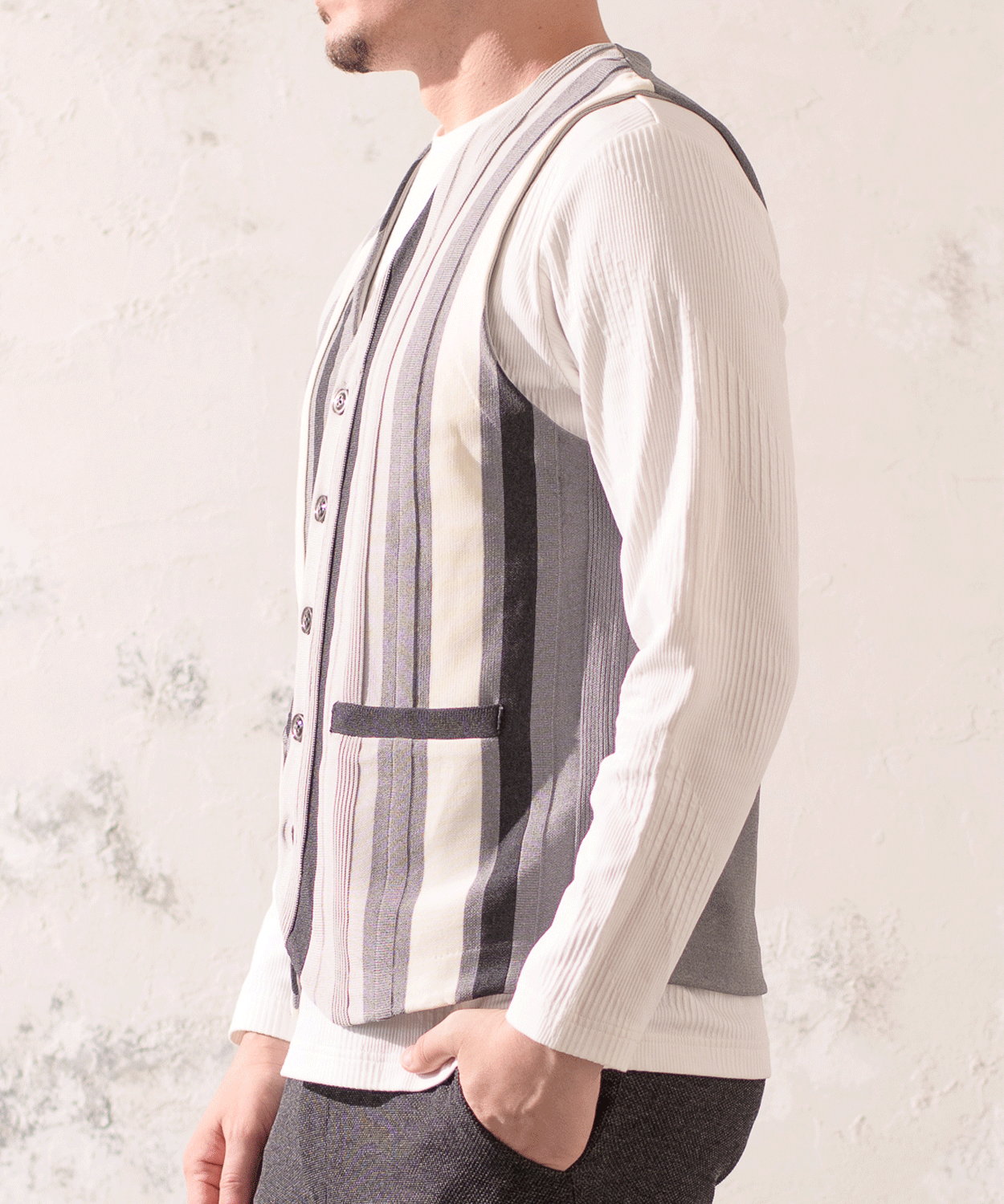 カジュアルシャツと合わせた上品なレイヤードはもちろん、ロンTとの組み合わせでリラックス感のあるスタイルにもマッチ。季節やシーンを問わず、日常の装いをさりげなく格上げしてくれる一着です。