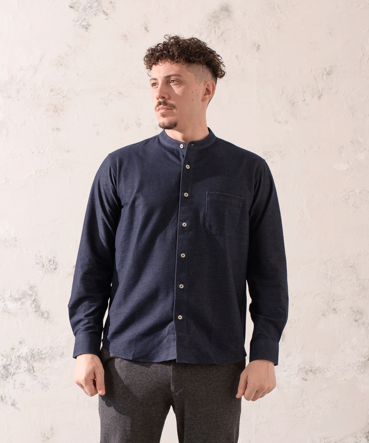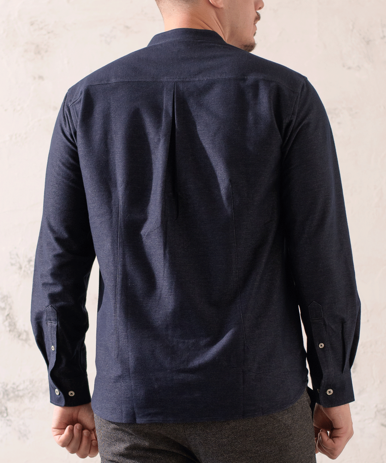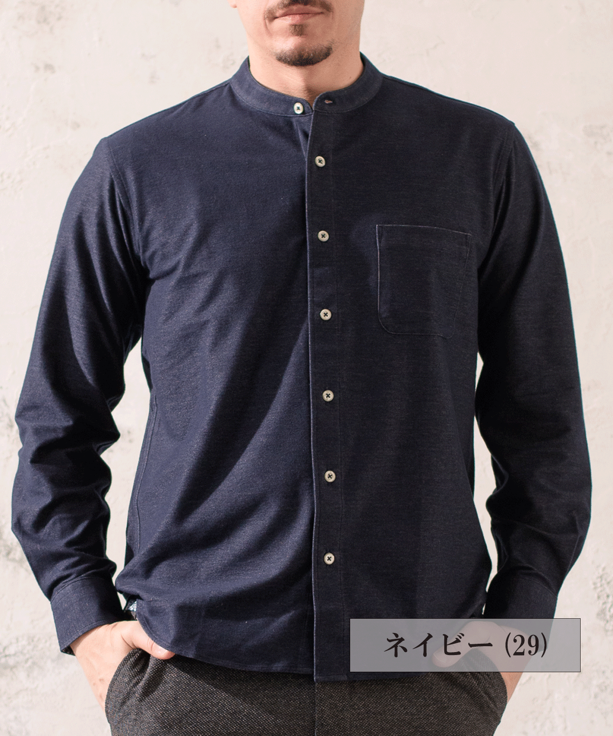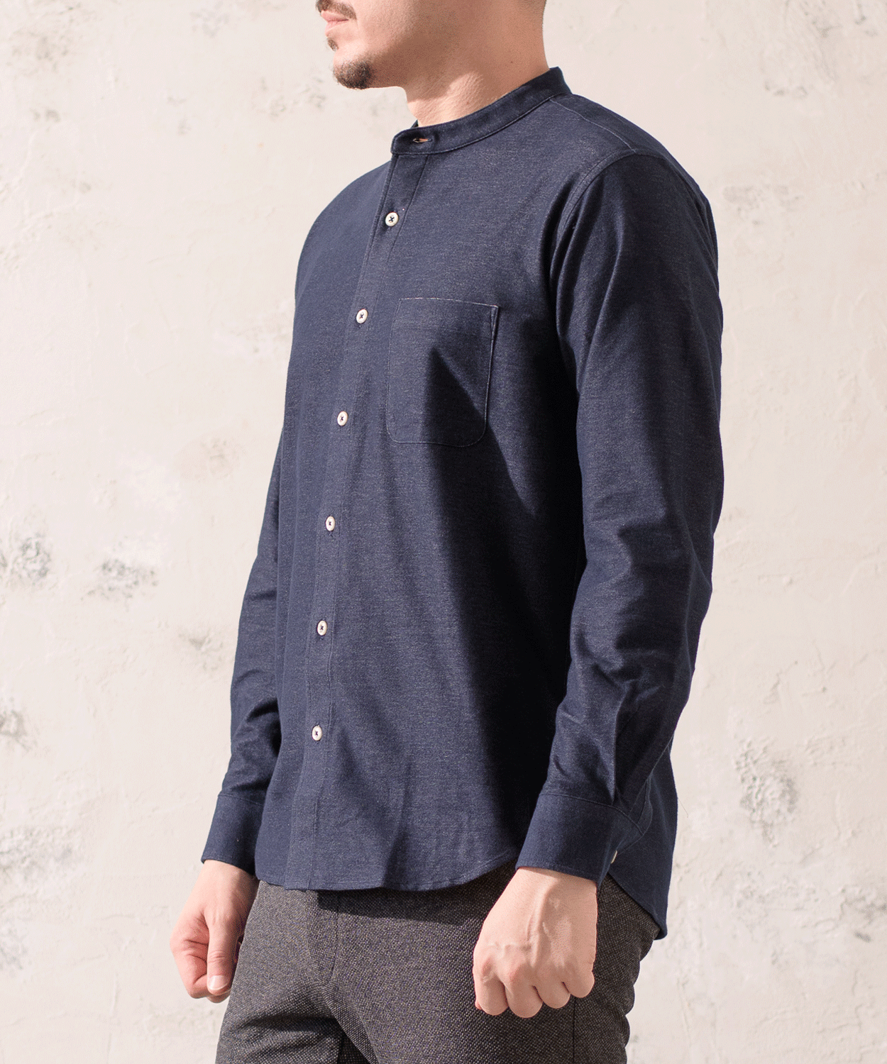 ストレッチ性のある快適なデニムジャージ生地を使用したスタンドカラーシャツです。