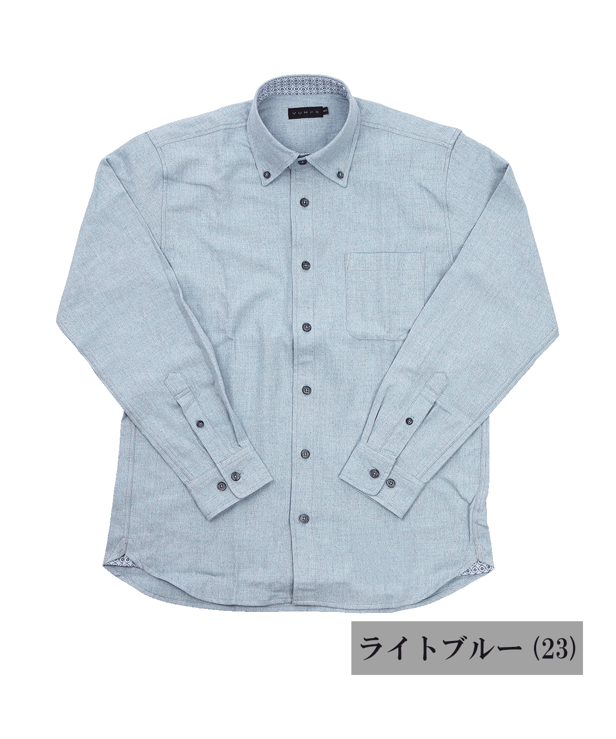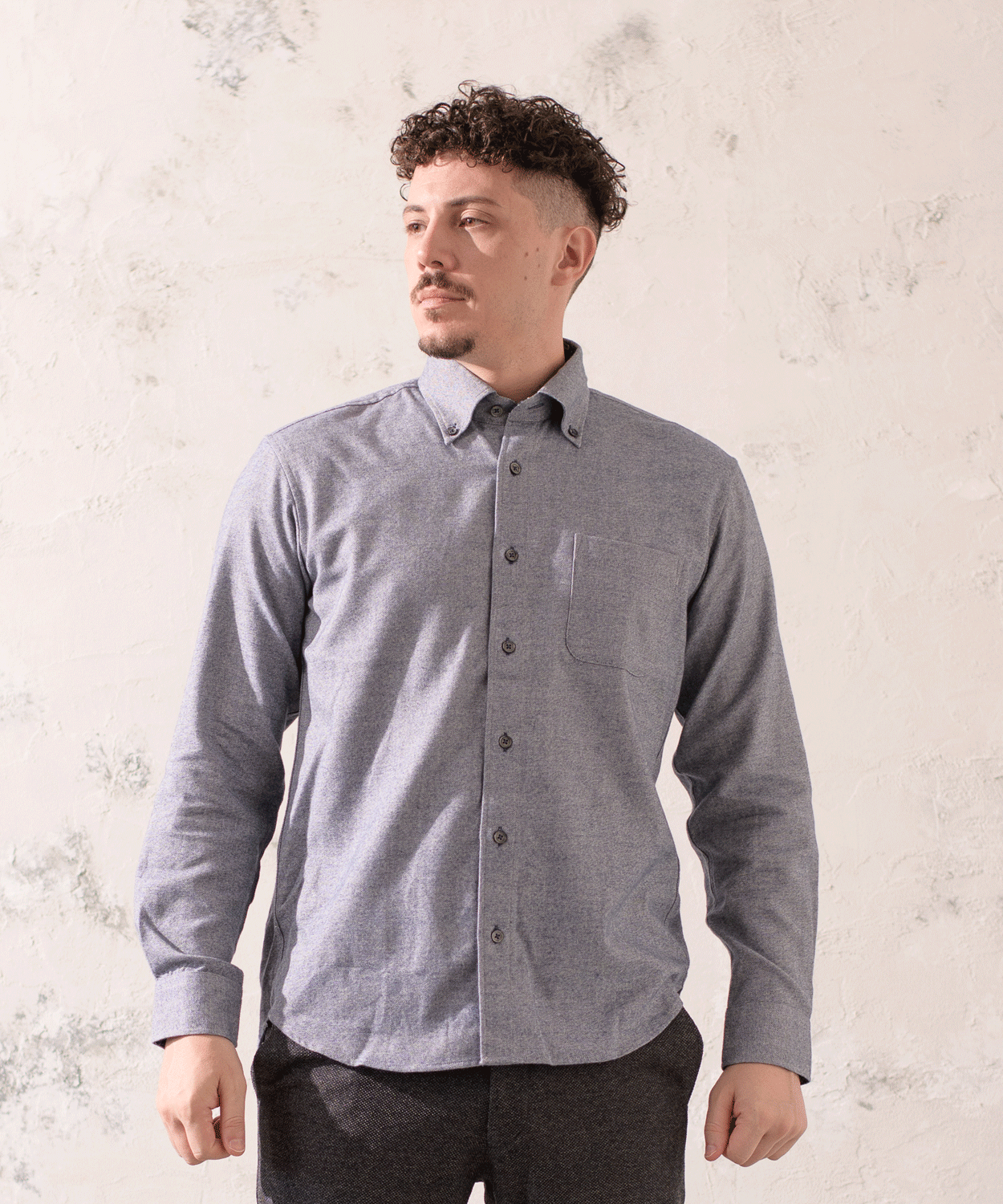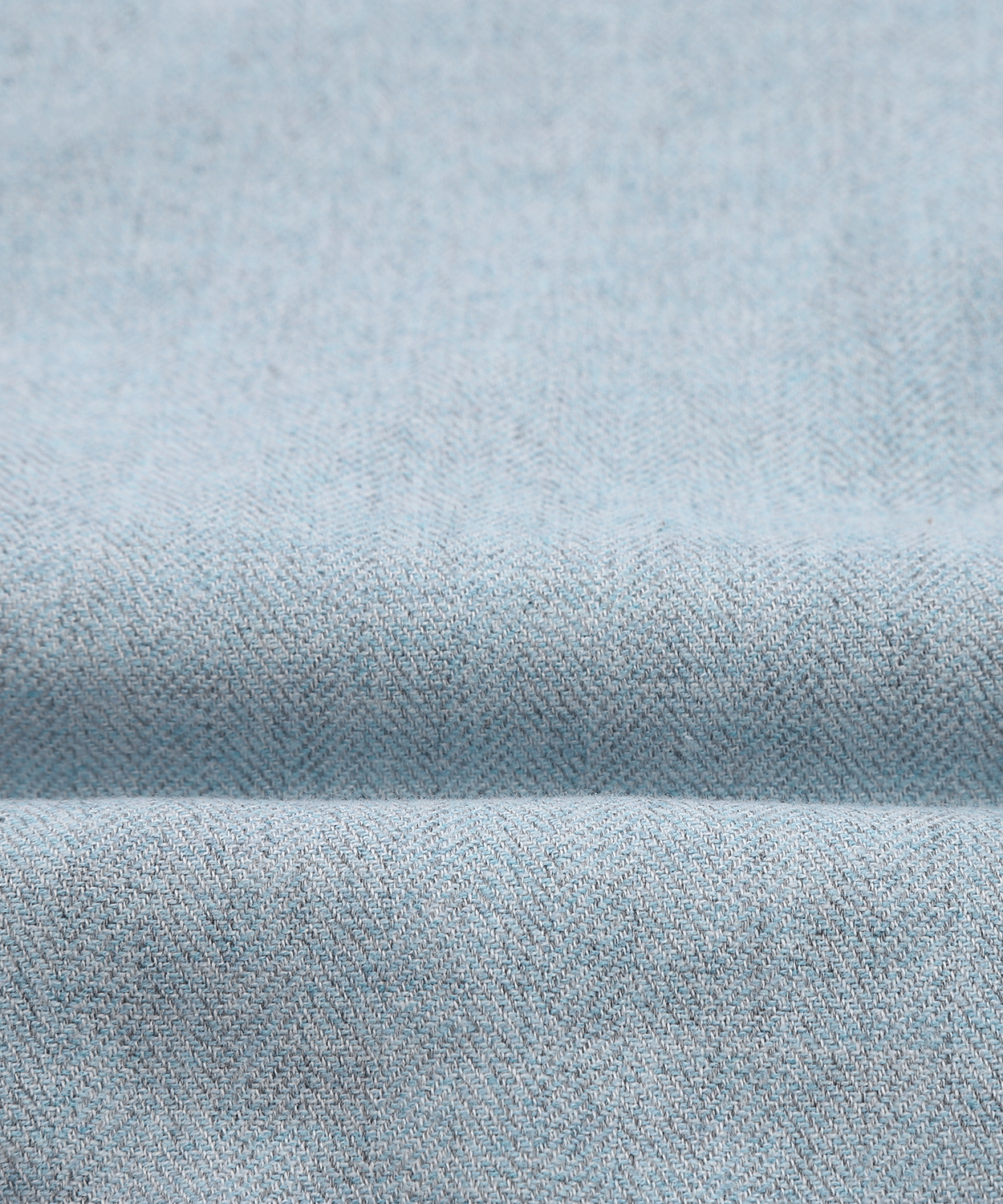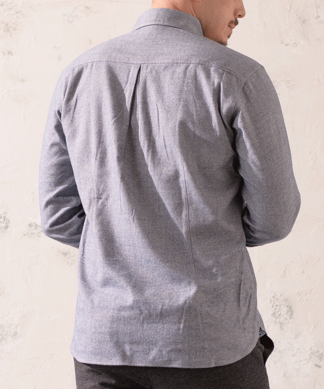 トップ染めによる杢カラーの深みと、細かなヘリンボン組織が上品に映えるフランネルシャツです。