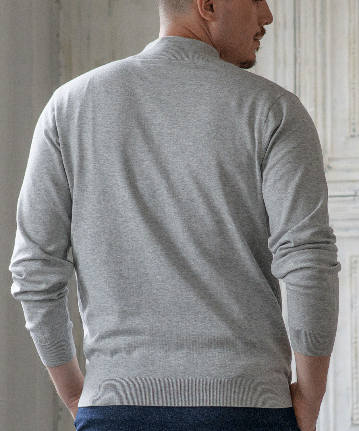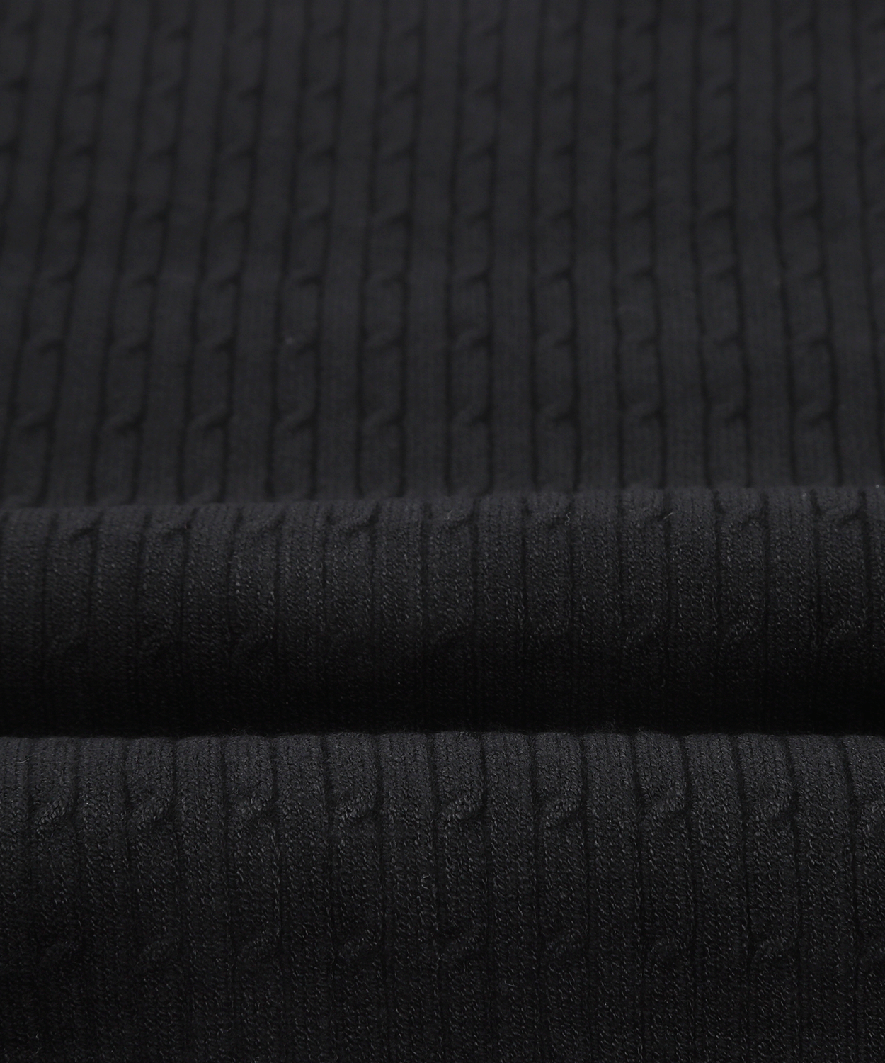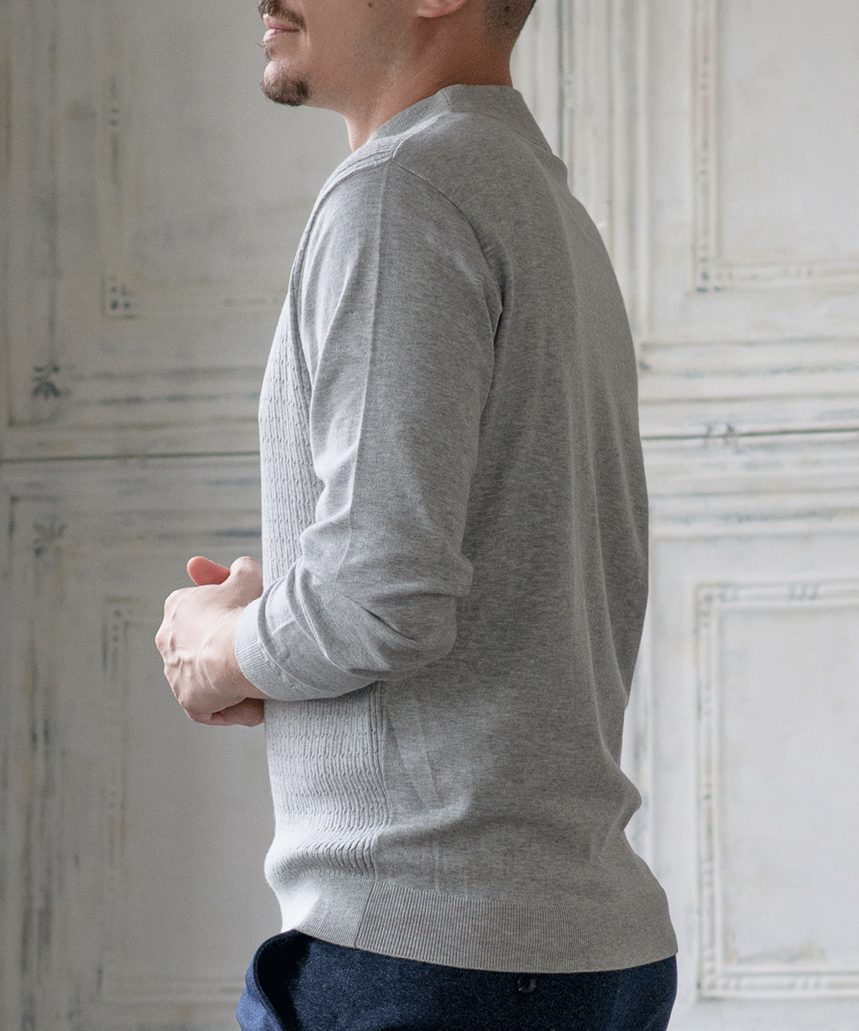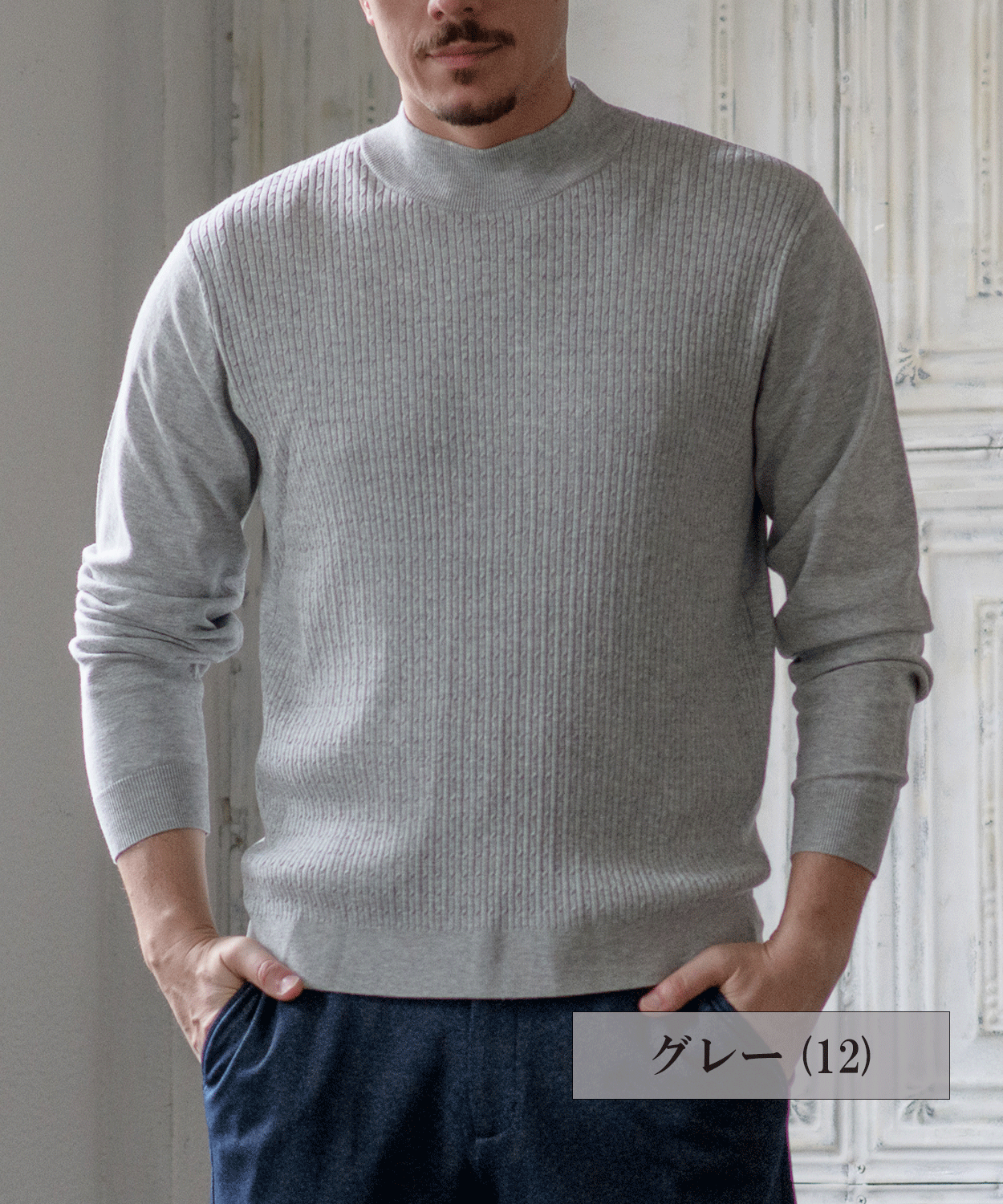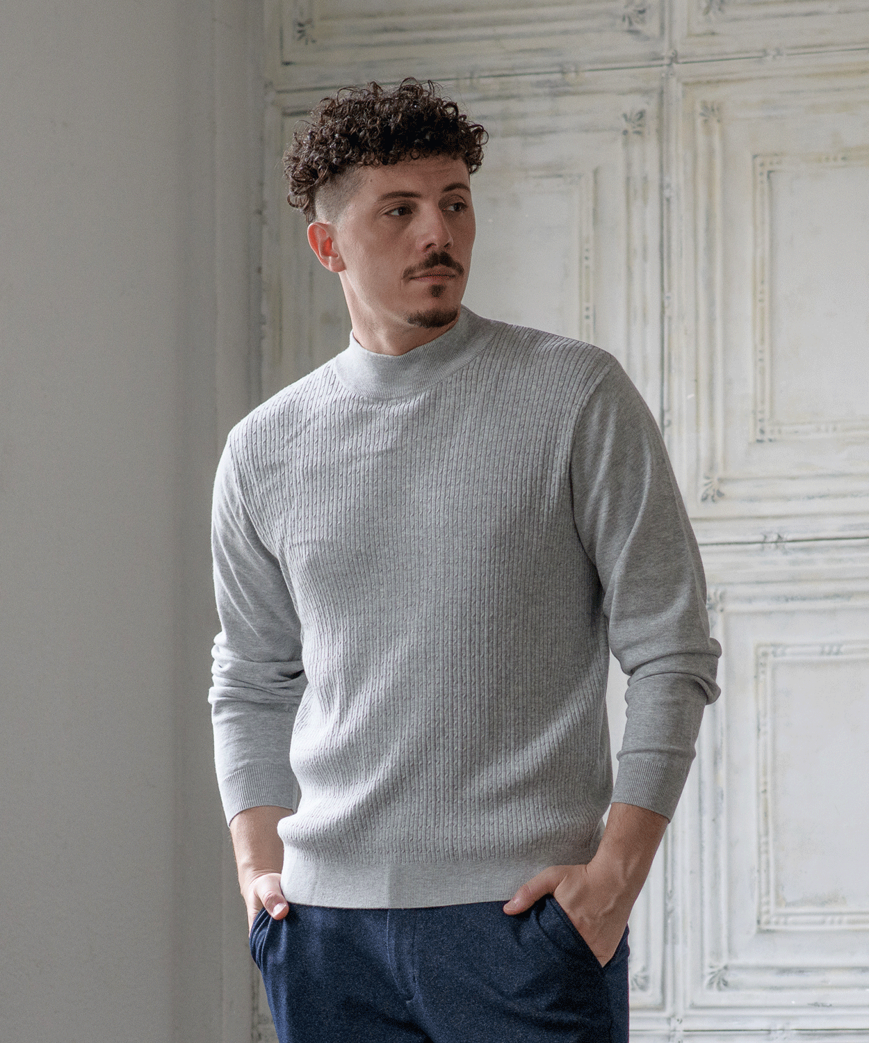 小さなケーブル柄でシックな雰囲気のモックネックニットは一枚での着用はもちろん、ジャケットなどのアウターとの親和性も高く、様々なコーディネートをお楽しみいただけます。