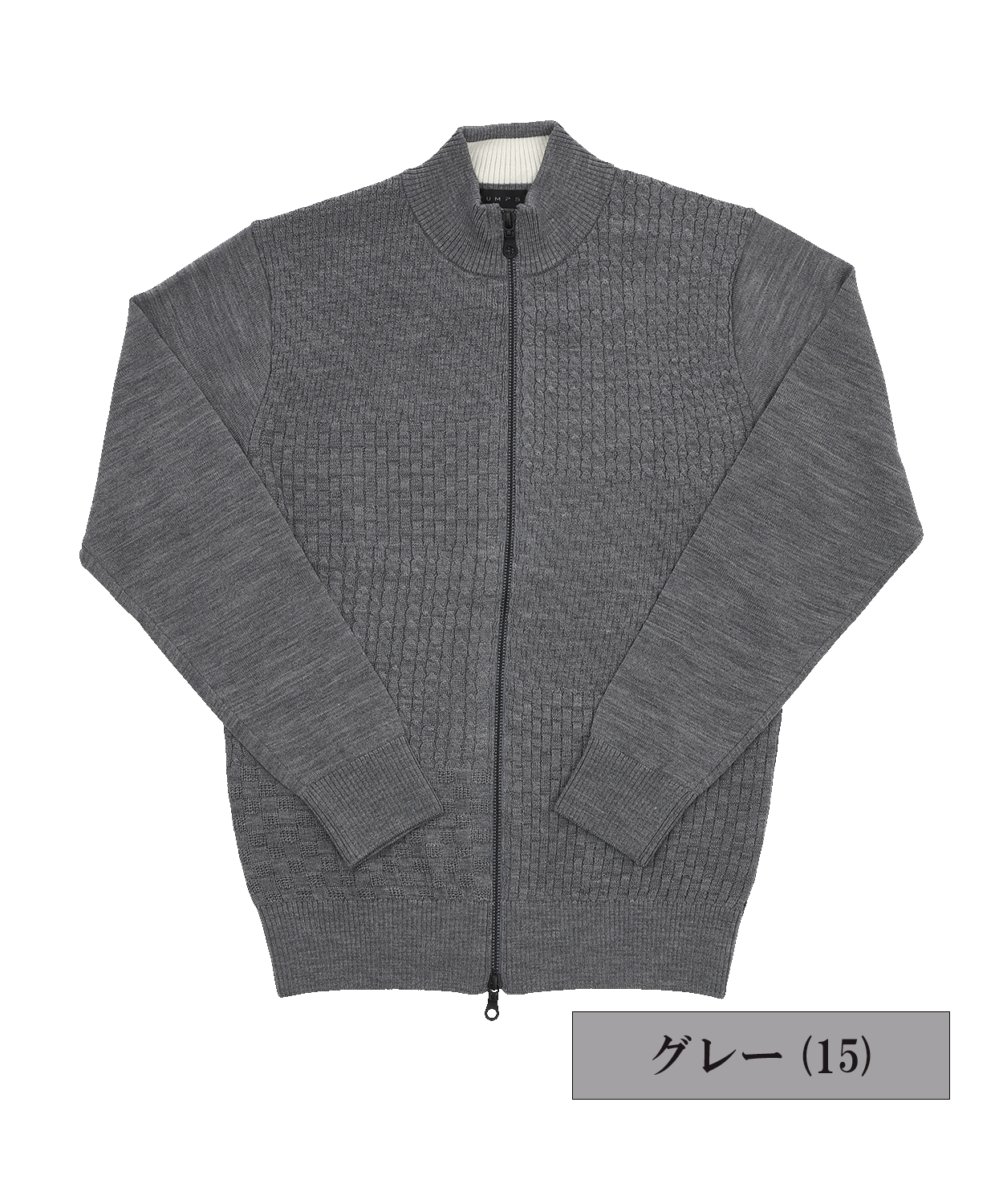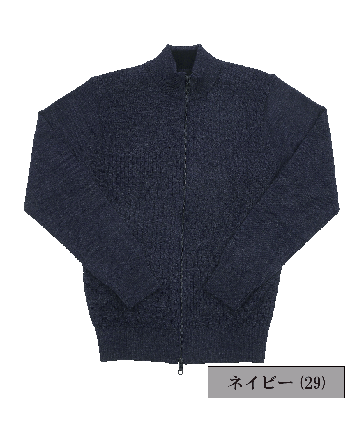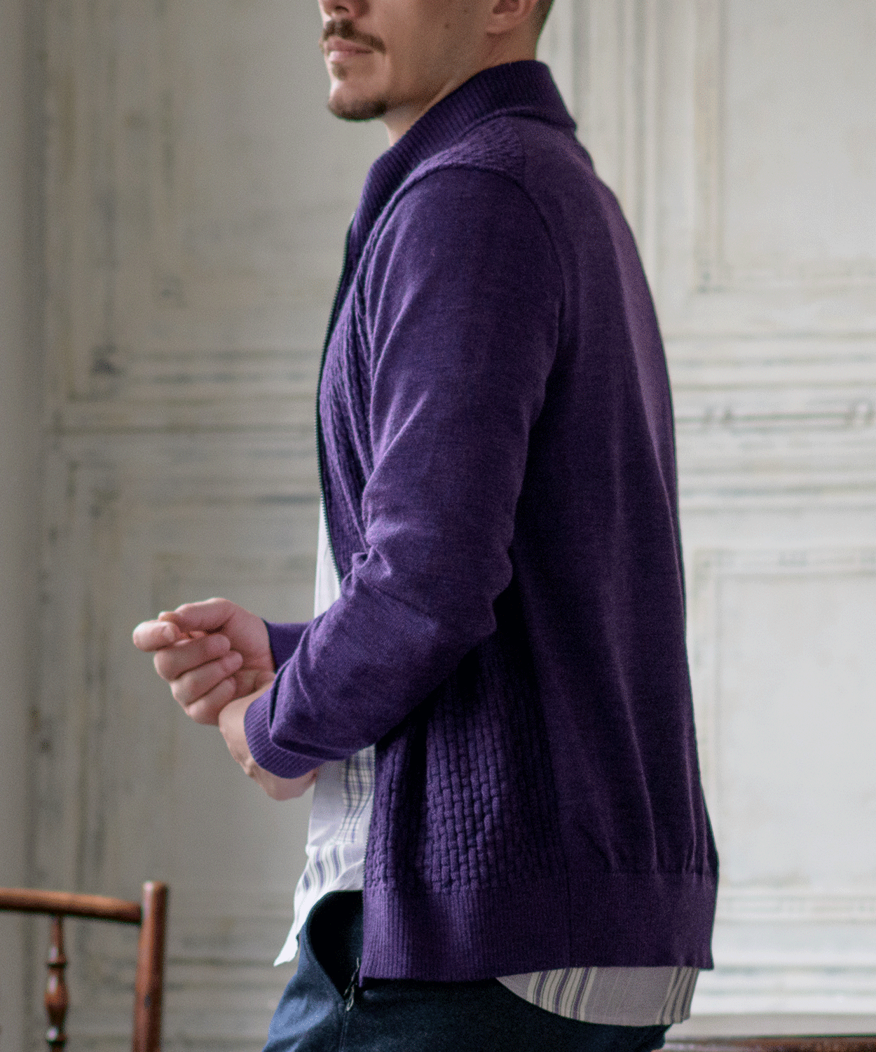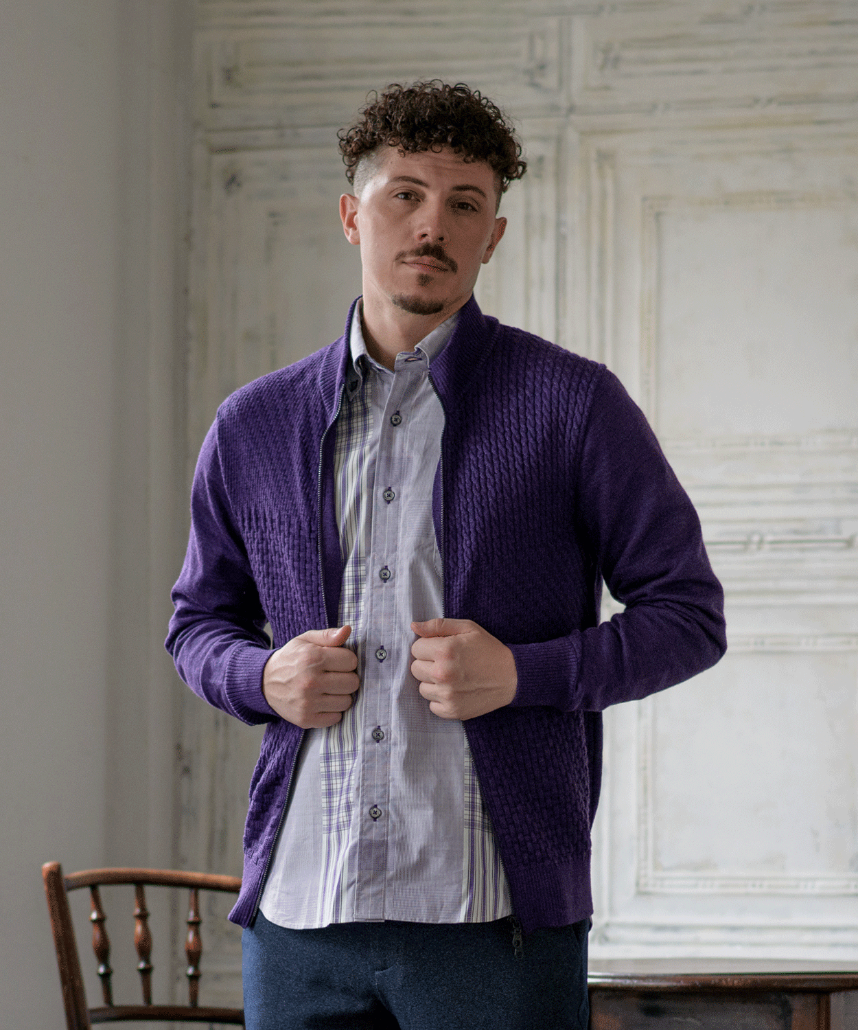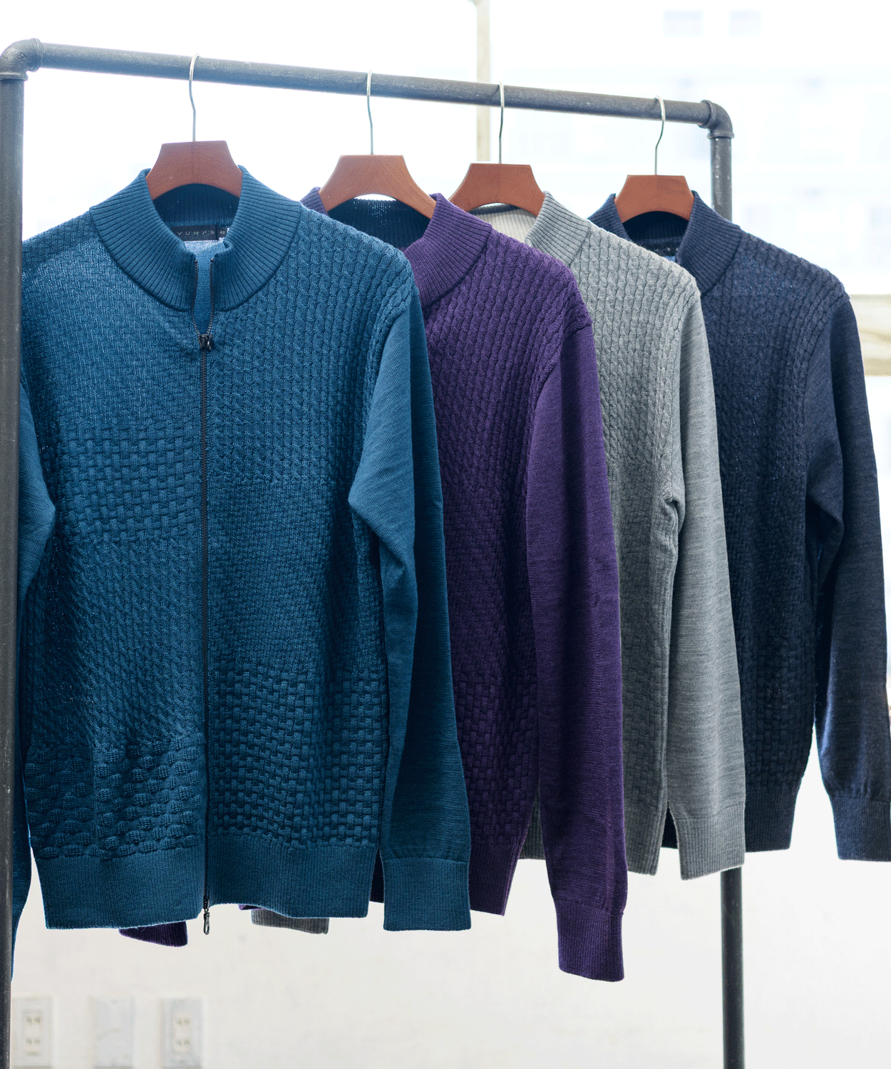 前身頃左右で編み組織を変えて、アシンメトリーデザインにしたフルジップカーディガンです。